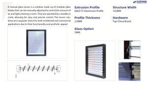 This manual glass louver window is composed of multiple glass blades set within durable 6063-T5 aluminum profiles with a 2.0mm thickness, offering excellent strength and resistance to corrosion.